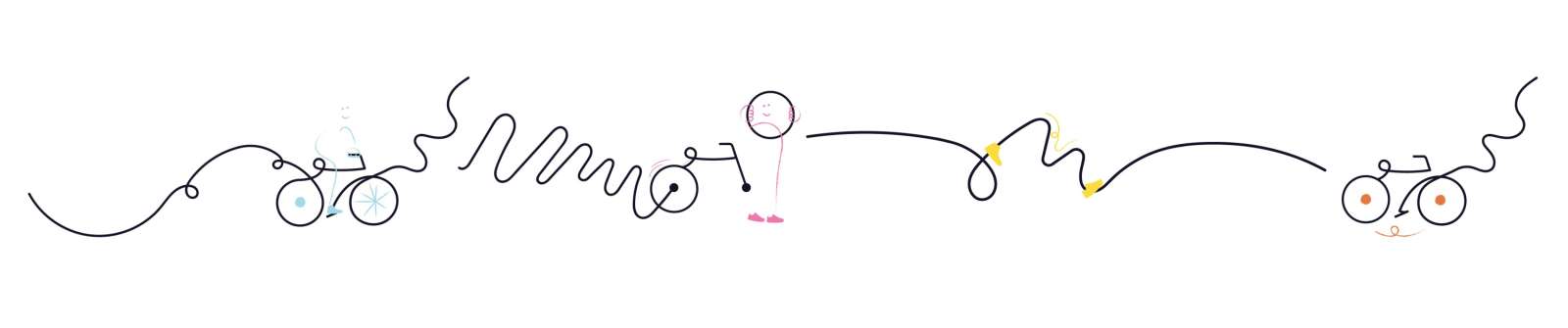 L'identité visuelle, pensée et renforcée par une idée de mouvement, est dans un style "doodles". Un univers graphique illustré en découle, fait de formes simples et dynamiques, inspirées de gestes liés à la marche ou au vélo.